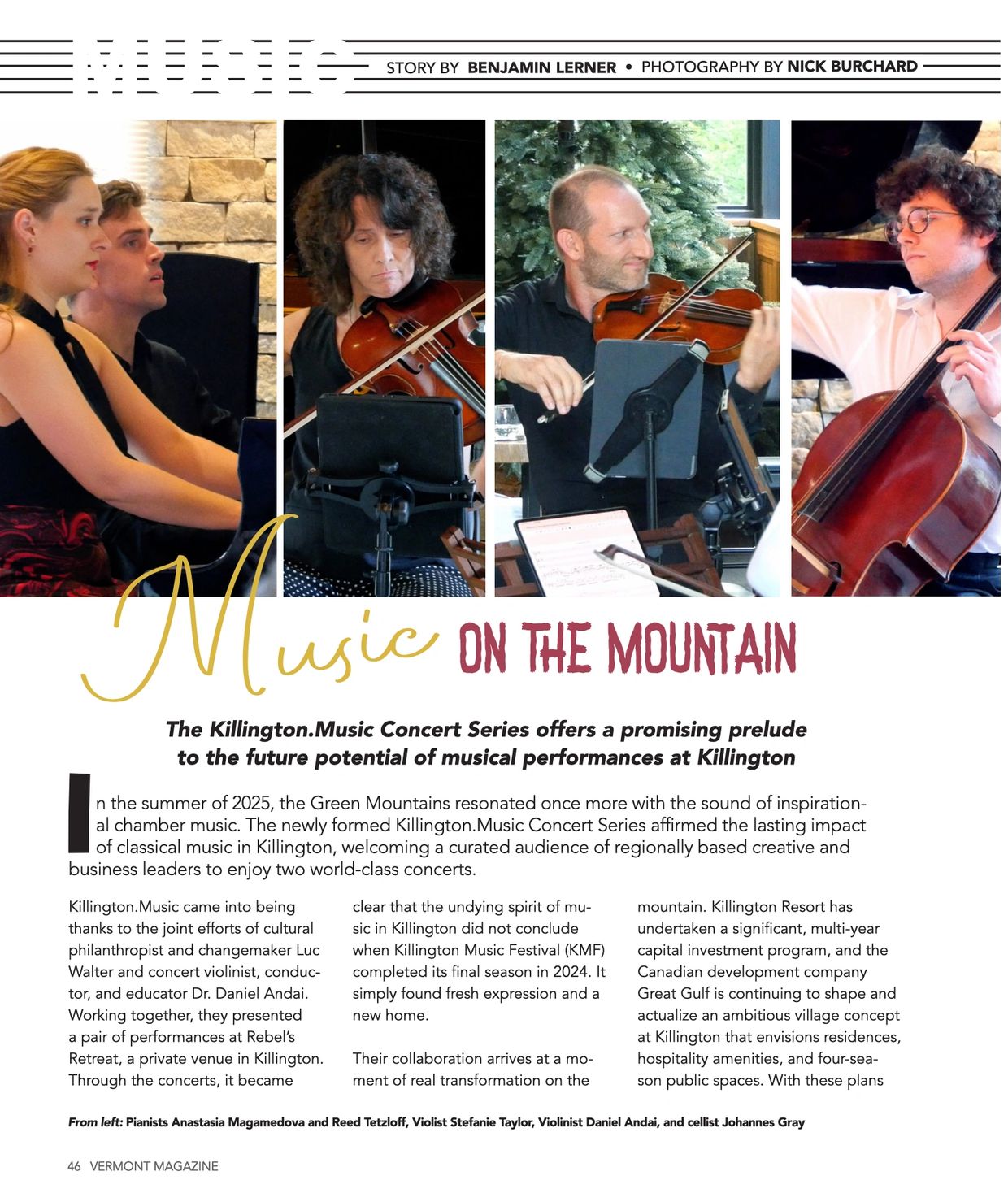"Killington Music Festival opened its 30th anniversary season...with a splendid evening of extroverted chamber music expertly played. The major work was Tchaikovsky's Souvenir de Florence. The performance, like the work, was beautifully extravagant. These fine string players barely contained their joy in this music making. Of note - and illustrative of the quality of the school's faculty - was the lusciously lyrical slow movement, Andante cantabile e con moto. In a tradeoff of the gorgeous melody, violinist Daniel Andai (concertmaster of Stowe's Music Festival of the Americas) began expressively with his warm lyrical sound. The line moved onto cellist Brian Manker (principal of the Montreal Symphony), who matched the warm expressiveness, and finally to rich sound of Timothy Deighton. It was delicious."